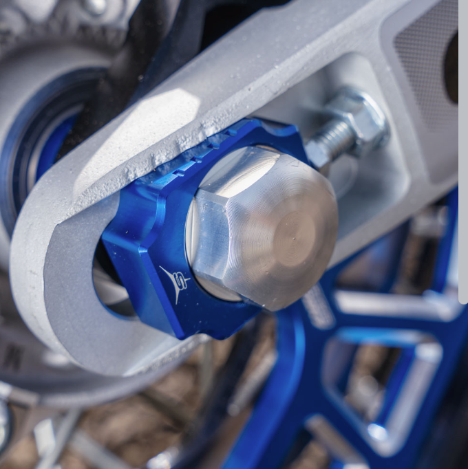 Give a fresh look to your bike with the Sherco blue Chain Tensioner. CNC machined from anticorodal aluminum billets, laser engraved and milled after anodizing.