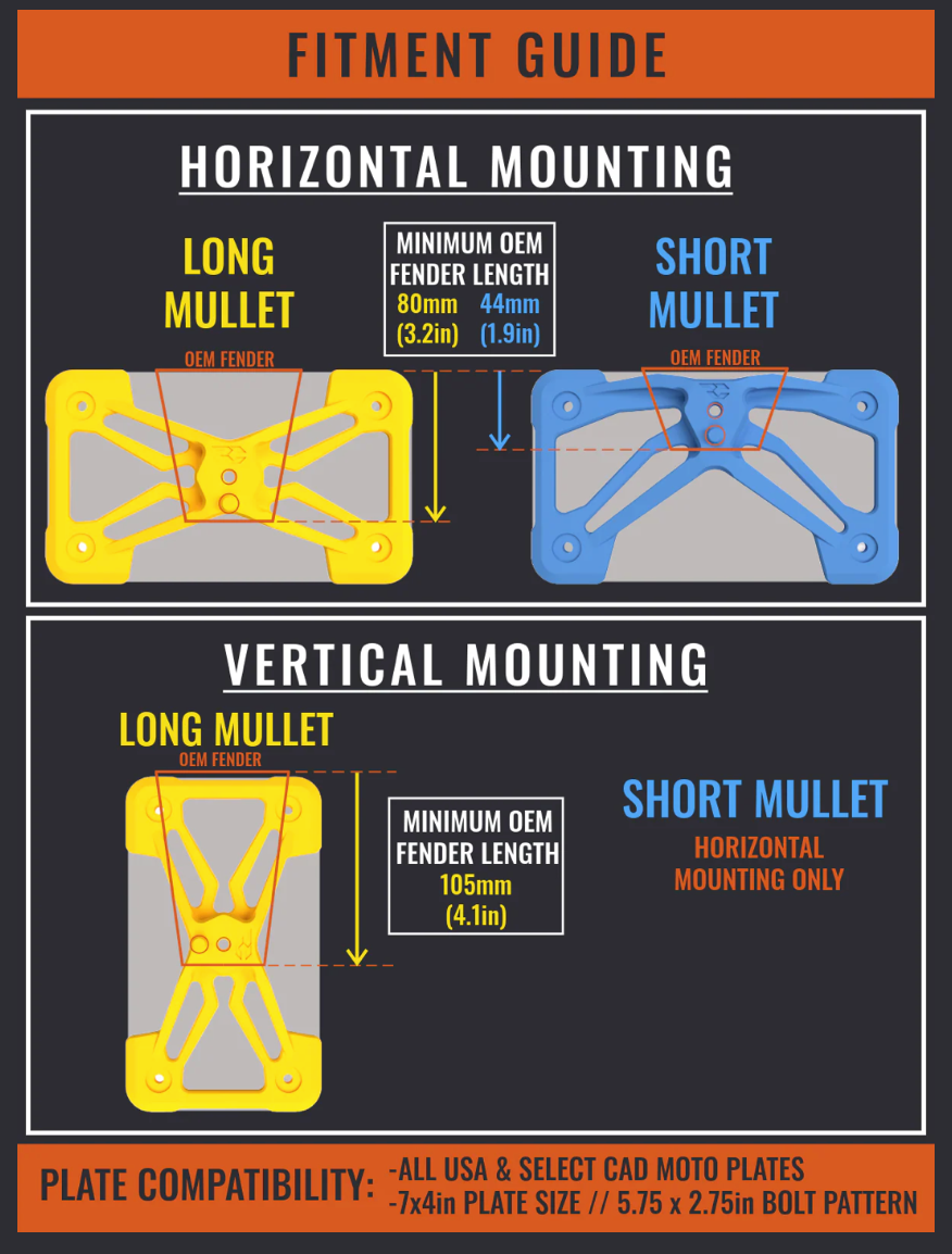 If mounting to an aftermarket drop fender/taillight on a Yamaha, Honda or Suzuki the Short Mullet is guaranteed to fit. However, the Sicass and Acerbis drop fenders can accommodate the Long Mullet to allow for vertical and horizontal plate mounting.