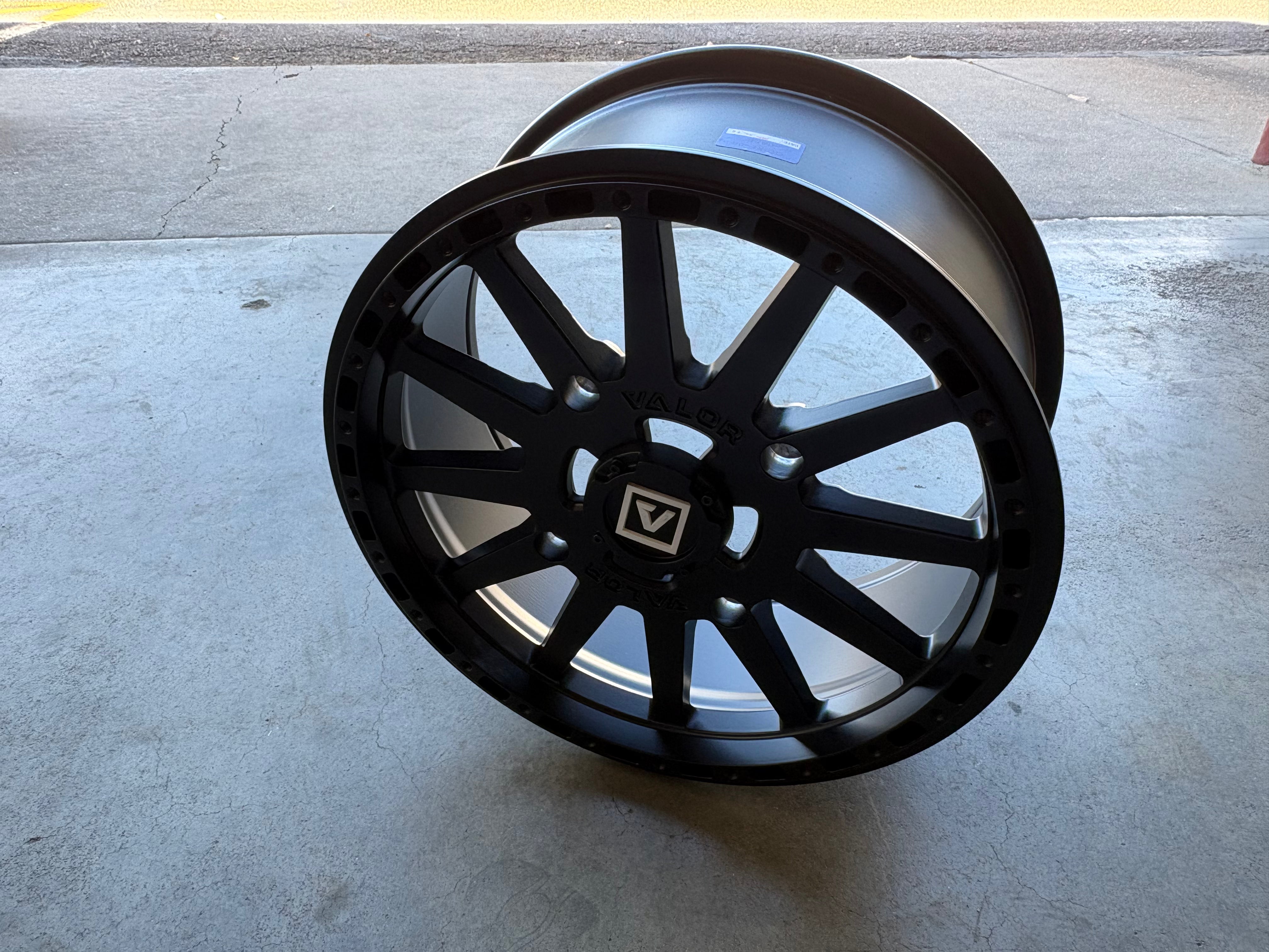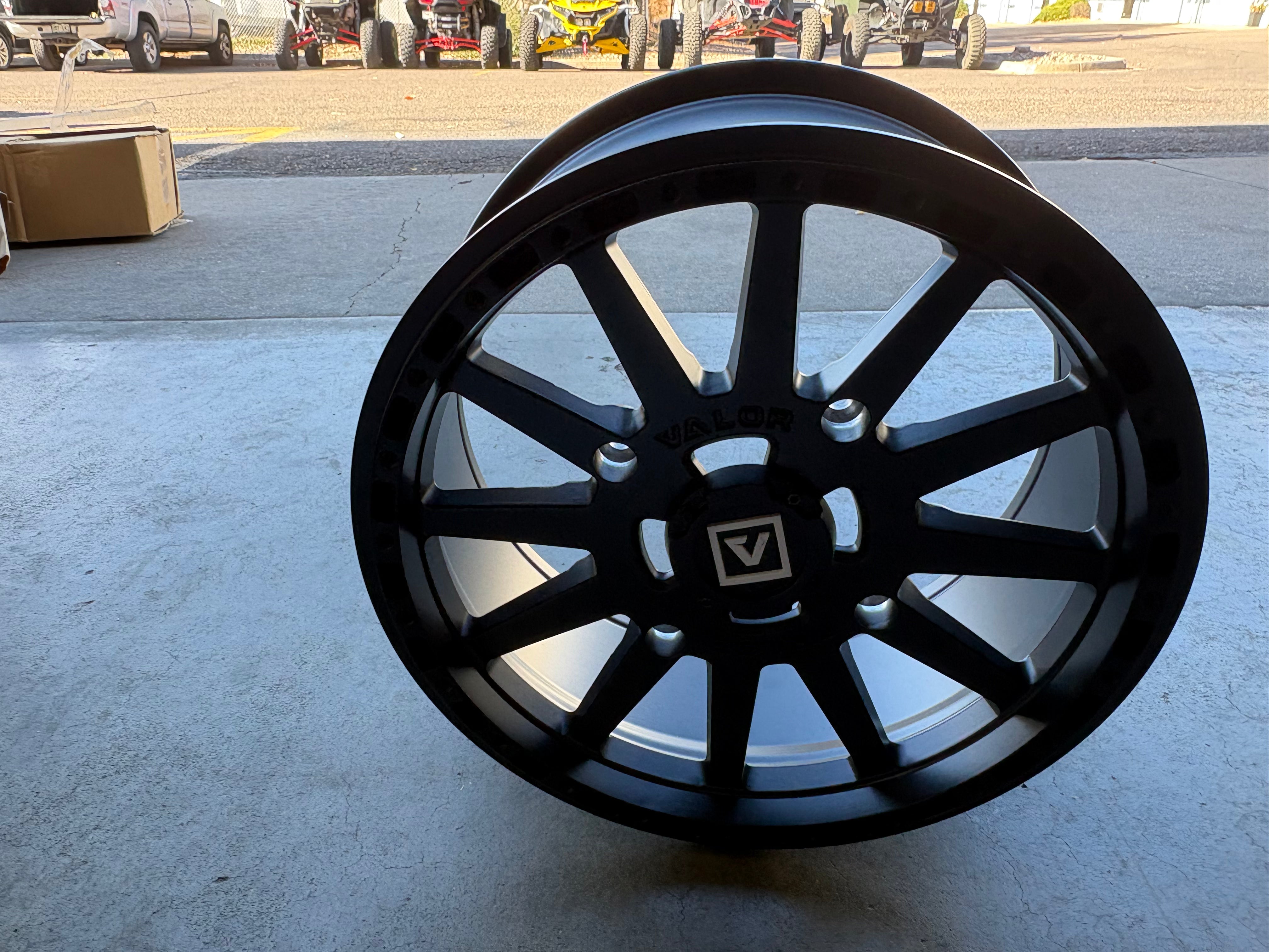 The V05 wheel is manufactured using only A356 aluminum with T6 heat treatment for one super strong wheel. Forged 6061 aluminum beadlock ring. Clean twelve spoke design with debossed VALOR logo. Offroad inspired and reinforced inner lip. Engineered to exceed SAE 2530 safety specifications. Bolt-on shorty center cap with embossed white logo.